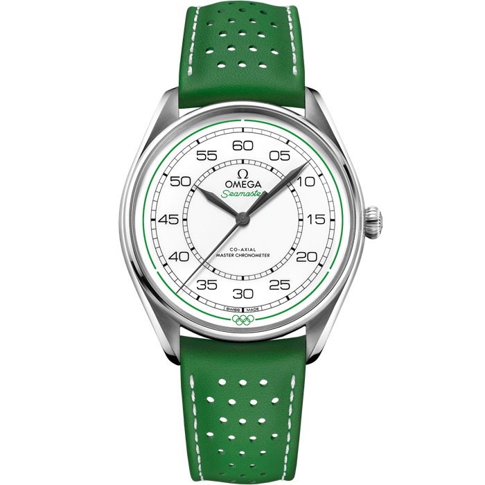 Sur le fond du boîtier, un anneau en aluminium anodisé vert porte le nom de toutes les villes hôtes et la date des éditions des Jeux Olympiques qui ont marqué et marqueront l’histoire de la Maison OMEGA, depuis Los Angeles en 1932 jusqu’à Los Angeles, à nouveau, en 2028.
