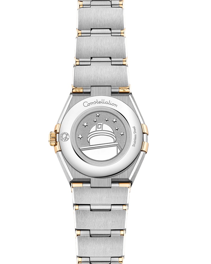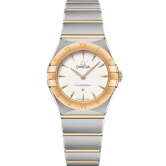 Ce modèle en acier inoxydable et or jaune18K de 25mm arbore une lunette gravée de chiffres romains, un cadran blanc cristal argenté et un verre saphir résistant aux rayures. Les aiguilles, le logo OMEGA, l’étoile Constellation et les index sont également façonnés en or jaune18K.