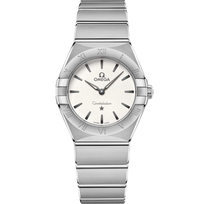 Ce modèle en acier inoxydable de 28mm arbore une lunette gravée de chiffres romains, un cadran blanc cristal argenté et un verre saphir résistant aux rayures. Les aiguilles, le logo OMEGA, l’étoile Constellation et les index, de couleur noire, offrent un superbe contraste avec le cadran blanc.