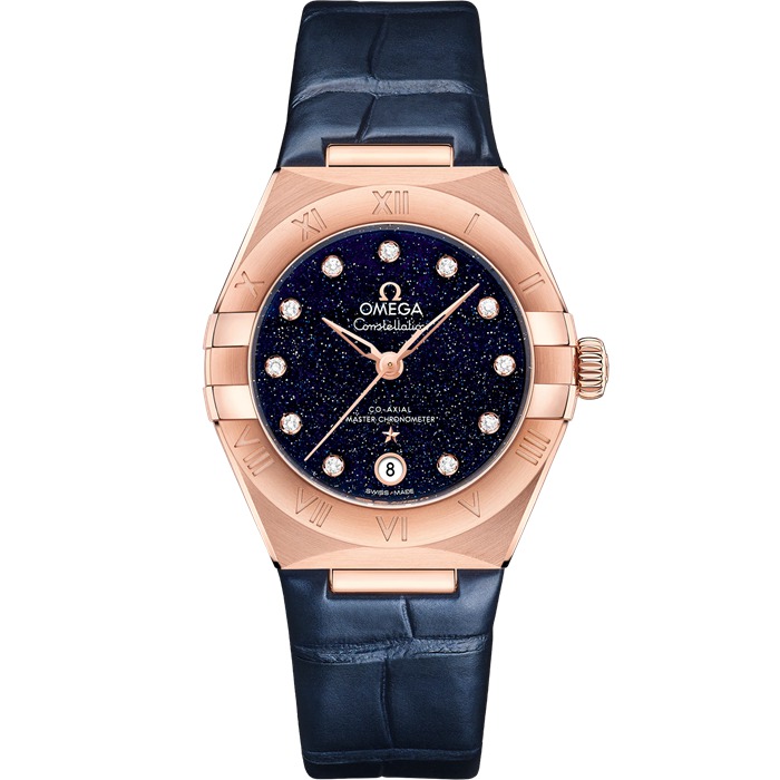 Ce modèle en or Sedna™ 18K de 29mm arbore une lunette gravée de chiffres romains, un cadran en verre d’aventurine bleu, des index sertis de diamants et un guichet de date à 6heures. Les aiguilles, le logo OMEGA, l’étoile Constellation et les chatons des diamants sont également façonnés en or Sedna™18K.