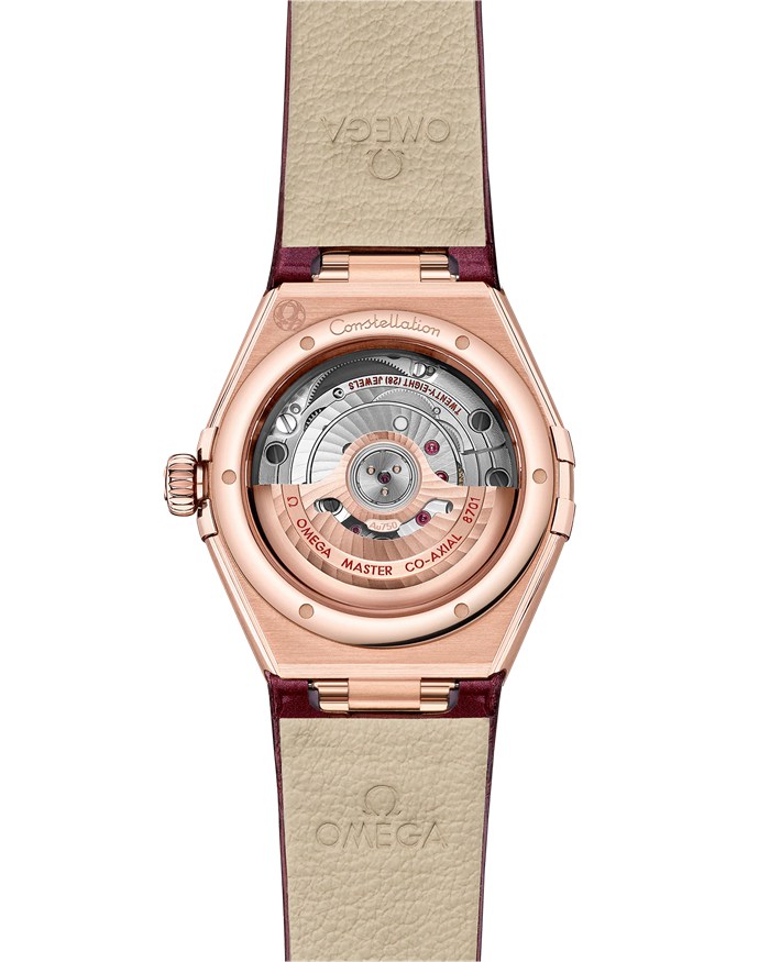 Ce modèle en or Sedna™18K de 29mm arbore une lunette pavée de diamants, un cadran en nacre perlée, des index sertis de diamants et un guichet de date à 6heures. Les aiguilles, le logo OMEGA, l’étoile Constellation et les chatons des diamants sont également façonnés en or Sedna™18K.