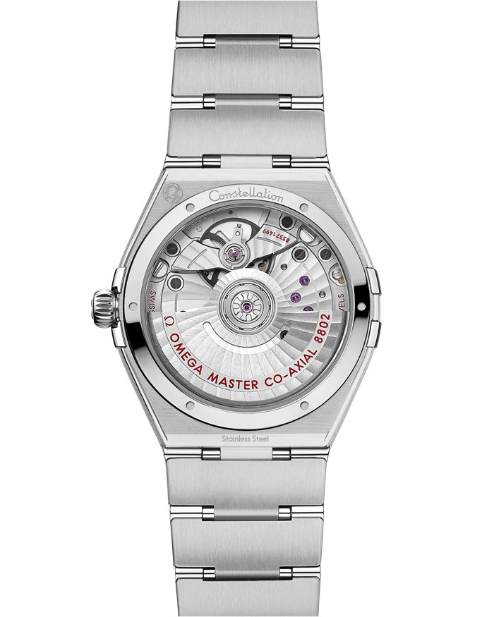Ce modèle en acier inoxydable de 34 mm arbore une lunette gravée de chiffres romains, un cadran soleillé bleu paon et un guichet de date rond à 6 heures. Les index incrémentaux sertis de diamants se présentent sur des chatons en or blanc 18K, tandis que le compteur de la petite seconde et le compteur central des minutes sont encerclés par des anneaux. Les aiguilles, le logo OMEGA et l’étoile Constellation sont également en or blanc 18K.