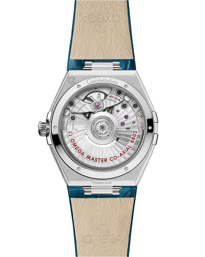 Ce modèle en acier inoxydable de 34 mm arbore une lunette gravée de chiffres romains, un cadran soleillé bleu paon et un guichet de date rond à 6 heures. Les index incrémentaux sertis de diamants se présentent sur des chatons en or blanc 18K, tandis que le compteur de la petite seconde et le compteur central des minutes sont encerclés par des anneaux. Les aiguilles, le logo OMEGA et l’étoile Constellation sont également en or blanc 18K.