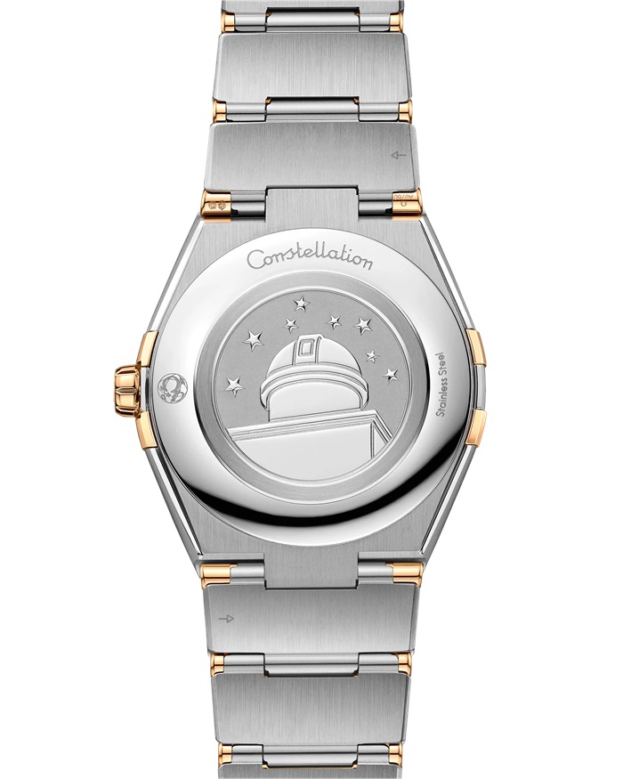 Ce modèle de 36 mm en acier inoxydable et or jaune18K arbore une lunette gravée de chiffres romains, un cadran opalin argenté et un guichet de date à 6heures. Les aiguilles, le logo OMEGA, l’étoile Constellation et les index sont en or jaune 18K.