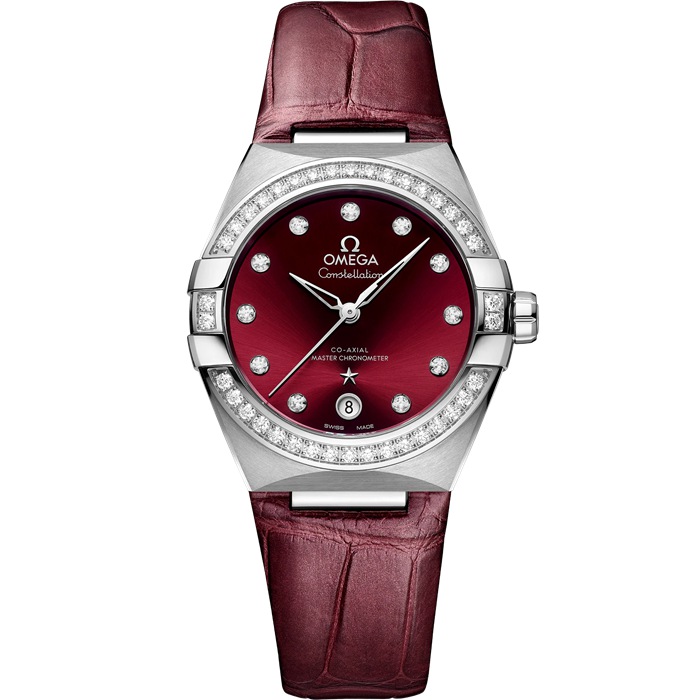 Ce modèle en acier inoxydable de 36 mm arbore une lunette polie sertie de 38 diamants, un cadran bordeaux traité PVD avec finition soleillée et un guichet de date à 6 heures. Les aiguilles, le logo OMEGA, l’étoile Constellation et les index sont en or blanc 18K.