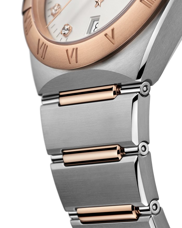 L’esthétique reconnaissable et intemporelle de la collection OMEGA Constellation se caractérise par ses fameuses demi-lunes, la présence des célèbres « griffes » sur le boîtier et son bracelet mono-rang.