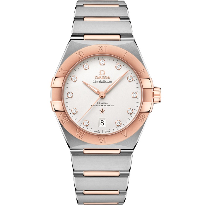 Ce modèle en acier inoxydable et or Sedna™ 18K de 39 mm arbore une lunette gravée de chiffres romains, un cadran opalin blanc argenté avec index en diamants et un guichet de date à 6 heures. Les aiguilles, le logo OMEGA, l’étoile Constellation et les chatons des diamants sont tous façonnés en or Sedna™ 18K.
