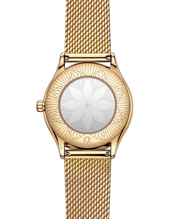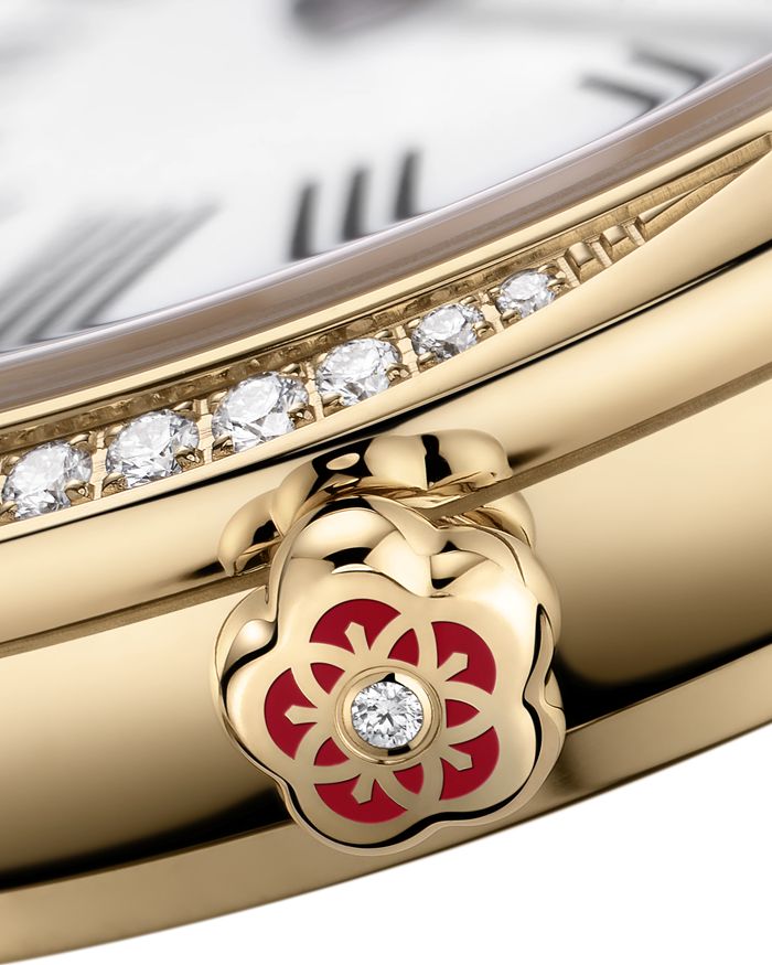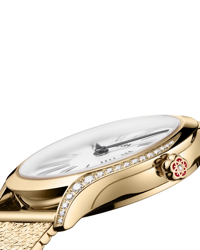 Elle arbore un boîtier de 26 mm en or Moonshine™ 18K, serti de diamants suivant délicatement les courbures de chaque côté. Un diamant unique orne la couronne, entouré d’une fleur en céramique liquide rouge. Le cadran bombé est réalisé en émail Grand Feu blanc crème et présente des aiguilles noircies et les chiffres romains en décalque.