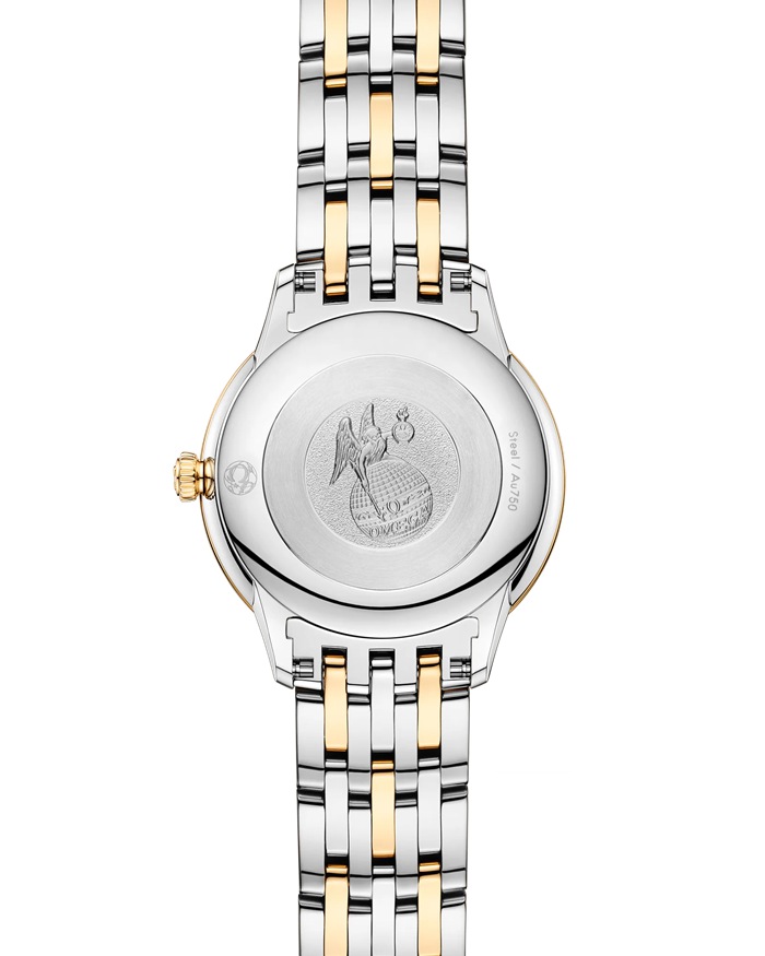 Sur ce modèle de 27,5 mm en or jaune 18K et en acier inoxydable, le cadran PVD en or Moonshine™ présente une finition soleillée. L’affichage se distingue par des aiguilles plaquées or jaune, ainsi que par l’alternance de chiffres romains et d’index cabochon. Le design épuré de la montre est complété par un fond frappé d’un médaillon représentant le dieu Chronos.
