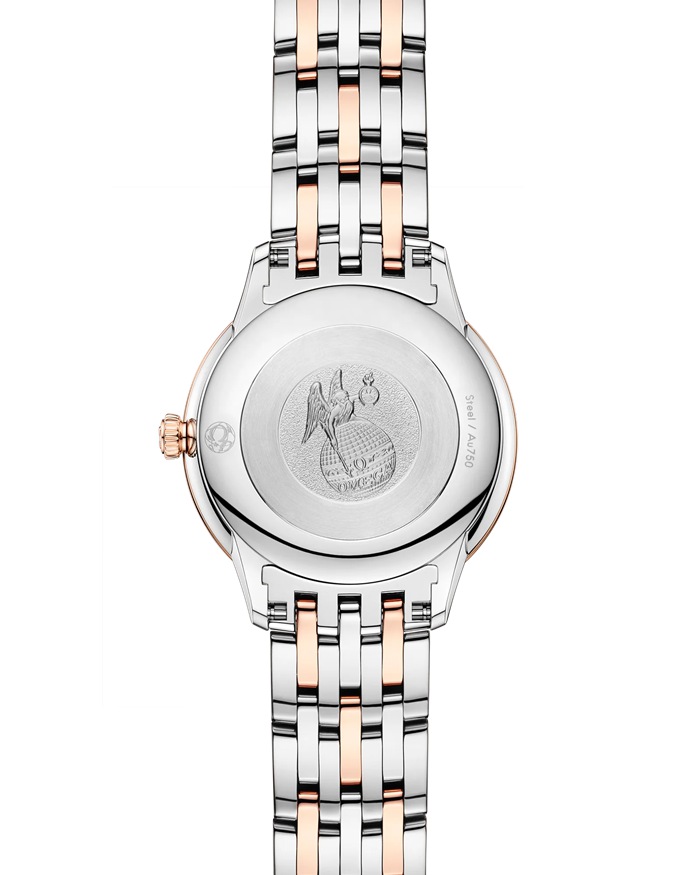 Sur ce modèle de 27,5 mm en or Sedna™ 18K et en acier inoxydable, le cadran argenté présente un motif vertical aléatoire estampé dans une finition soleillée. L’affichage se distingue par des aiguilles PVD de couleur or Sedna™, ainsi que par l’alternance de chiffres romains et d’index cabochon. Le design épuré de la montre est complété par un fond frappé d’un médaillon représentant le dieu Chronos.
