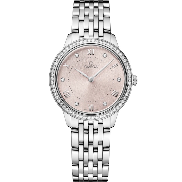 Ce modèle de 30mm en acier inoxydable arbore une lunette pavée de diamants et un cadran en PVD rose-argenté au motif vertical aléatoire estampé dans une finition soleillée. L’affichage se distingue par des aiguilles rhodiées, ainsi que par l’alternance de chiffres romains et d’index diamantés.