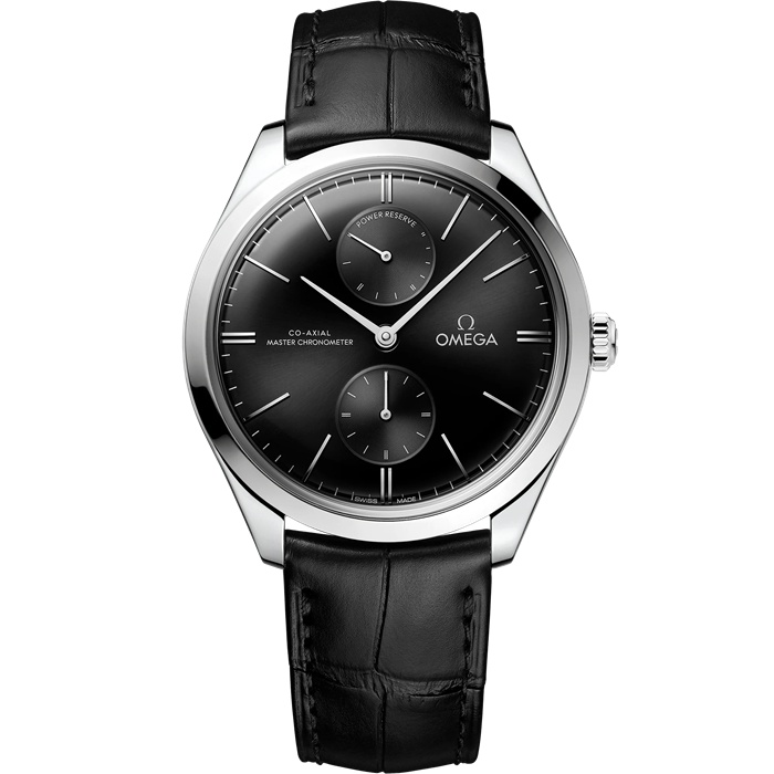 Ce modèle présente un boîtier poli en acier inoxydable de 40mm monté sur un bracelet en cuir noir. Le cadran bombé noir comprend un affichage de la réserve de marche à 12heures, un guichet pour la petite seconde à 6heures ainsi que des aiguilles et des index bombés en or blanc 18K.