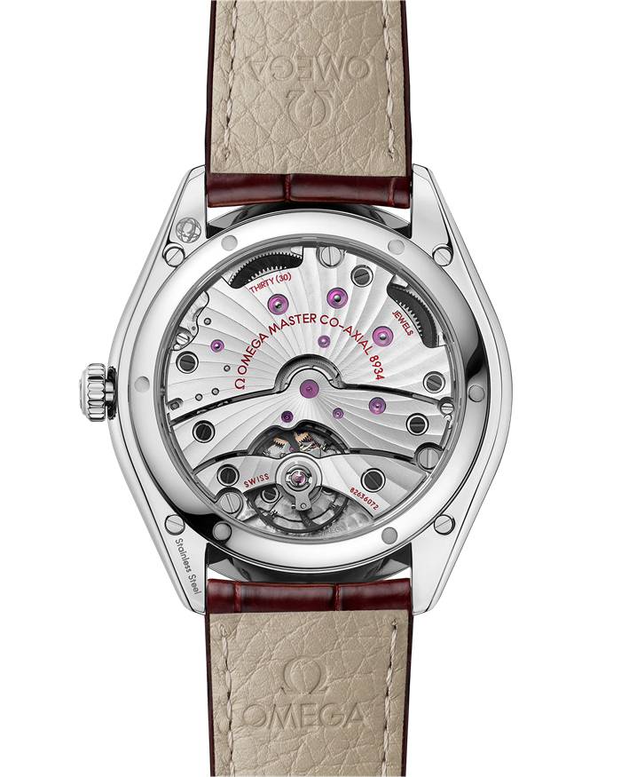 Monté sur un bracelet en cuir bordeaux, ce modèle est doté d’un boîtier de 40mm en acier inoxydable poli et d’une lunette pavée de 72diamants taille pleine. Le cadran bombé bordeaux comprend un affichage de la réserve de marche à 12heures, un guichet pour la petite seconde à 6heures ainsi que des aiguilles et des index bombés en or blanc 18K.
