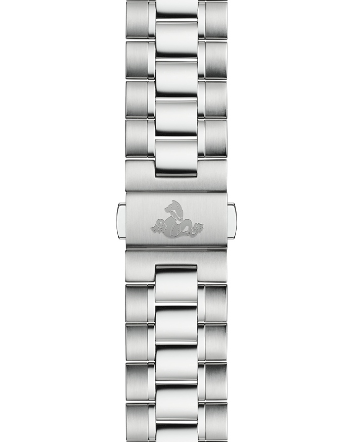 Le boîtier en acier inoxydable est cerclé d’une lunette en aluminium bleu frappée d’une échelle tachymétrique.