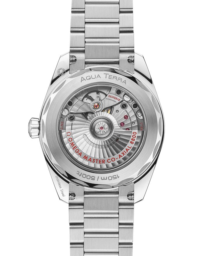 La Seamaster Aqua Terra est un magnifique hommage au vaste patrimoine maritime d’OMEGA. Ce modèle de 38mm possède un boîtier symétrique et une couronne en acier inoxydable entièrement poli ainsi qu’un fond de boîte orné d’un motif vagues.