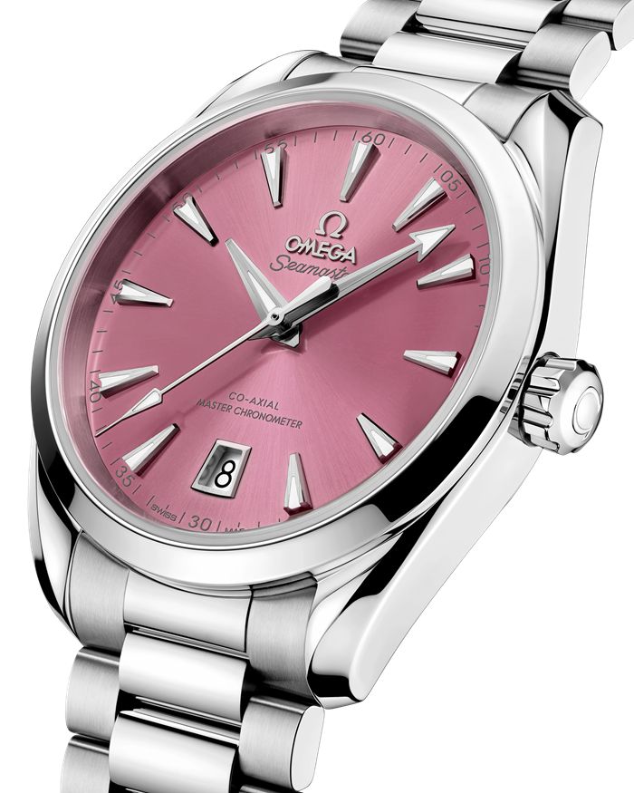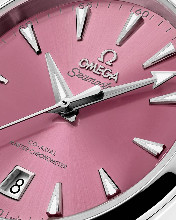Le cadran couleur rose coquillage, façonné à partir de laiton, est revêtu de laque et soleillé à partir du centre. Agrémenté d’aiguilles et d’index rhodiés revêtus de Super-LumiNova blanc, il affiche un guichet de date à 6heures.