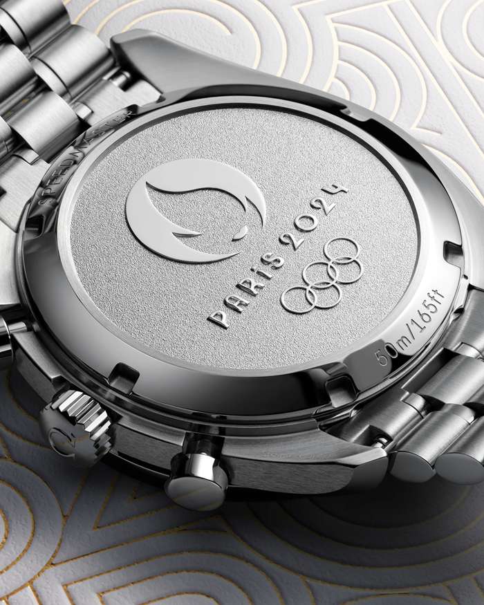 Au dos, le fond de boîtier commémoratif en acier inoxydable révèle un médaillon avec une base givrée, estampillée du logo Paris 2024 poli miroir avec l’inscription « Paris 2024 » et les anneaux olympiques.