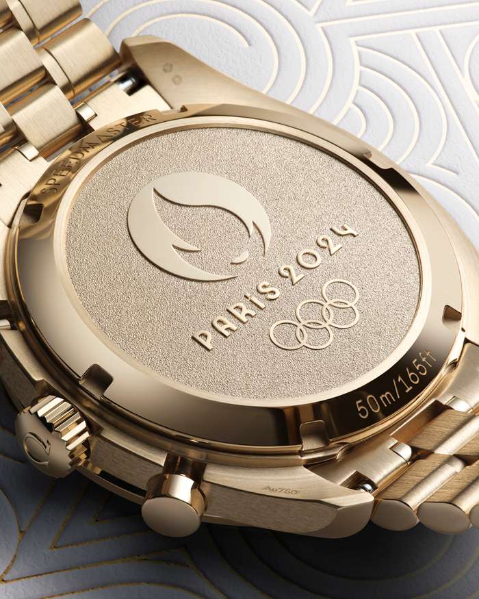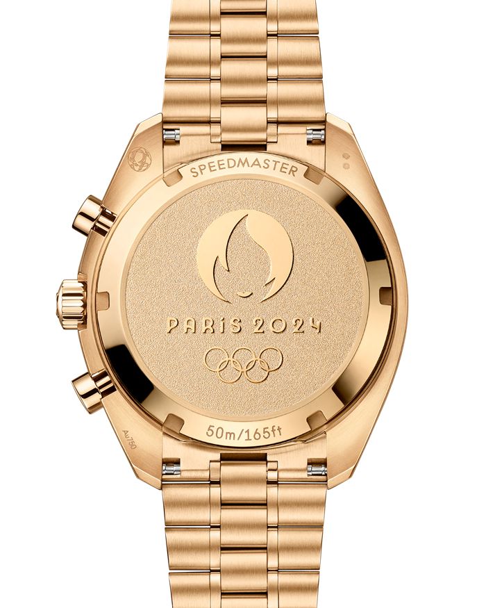 Au dos, le fond de boîtier commémoratif en or Moonshine™ 18K révèle un médaillon avec une base givrée, estampillée du logo Paris 2024 poli effet miroir avec l’inscription « Paris 2024 » et les anneaux olympiques.