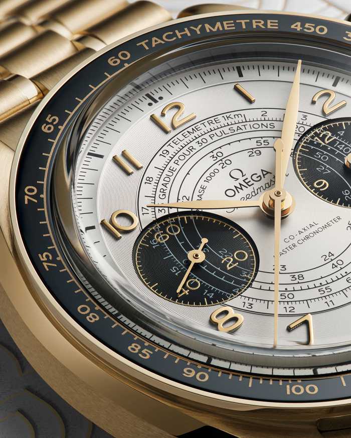 Ce modèle de 43 mm rend hommage aux Jeux Olympiques de Paris 2024 et arbore les trois couleurs principales de l’événement, à savoir l’or, le noir et le blanc. Cette montre est confectionnée en or Moonshine™ 18K avec un cadran opalin blanc argenté et des compteurs noircis. Elle se caractérise également par une lunette en céramique noire avec échelle tachymétrique en Ceragold™ OMEGA, des chiffres arabes en or Moonshine™ 18K, des aiguilles feuilles et des aiguilles des compteurs avec revêtement PVD or Moonshine™.