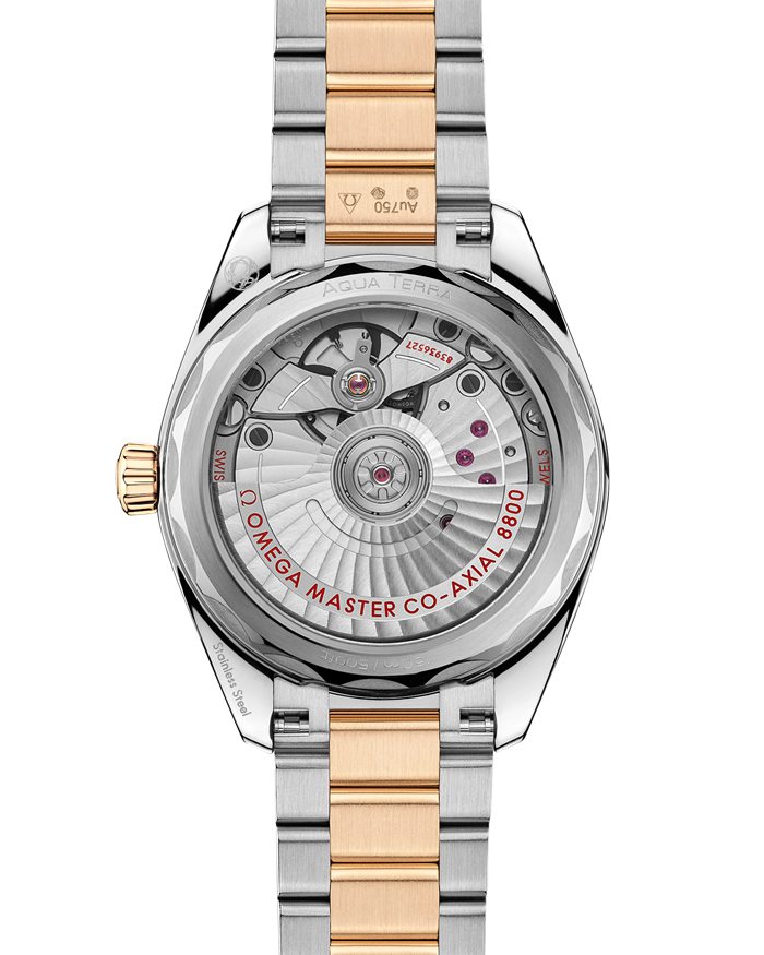 La Seamaster Aqua Terra est un magnifique hommage au vaste patrimoine maritime d’OMEGA. Ce modèle de 34 mm est doté d’un boîtier symétrique en acier inoxydable et en or Moonshine™ 18K, et d’un fond de boîte vissé orné d’un motif alvéolé.