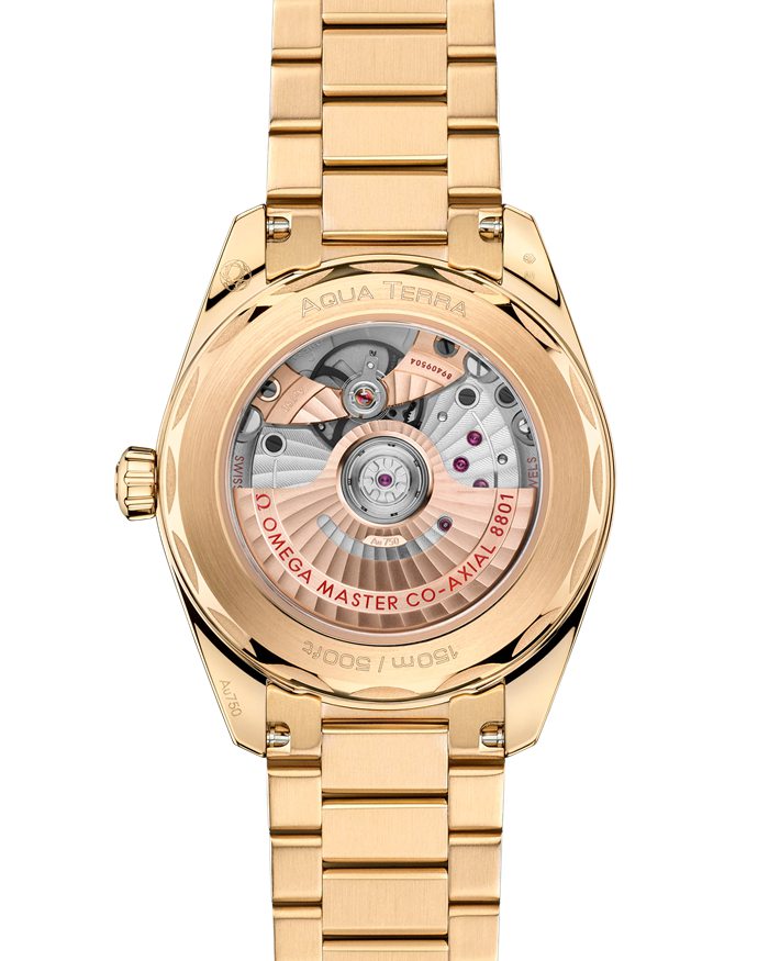 Ce modèle de 38 mm, confectionné en or Moonshine™ 18K poli, est doté d’une couronne conique et d’un fond de boîtier verre saphir plat à bords ondulés. Le cadran soleillé et laqué en or Moonshine™ traité PVD arbore un guichet de date circulaire à 6 heures cerclé d’or Moonshine™ 18K. OMEGA a également utilisé l’or Moonshine™ 18K sur ses aiguilles facettées et ses index caractéristiques en forme de coque de bateau et revêtus de Super-LumiNova blanc.