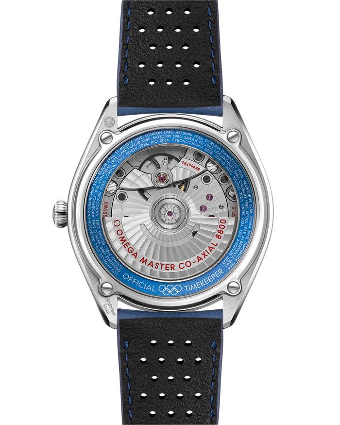 Sur le fond du boîtier, un anneau en aluminium anodisé bleu porte le nom de toutes les villes hôtes et la date des éditions des Jeux Olympiques qui ont marqué et marqueront l’histoire de la Maison OMEGA, depuis Los Angeles en 1932 jusqu’à Los Angeles, à nouveau, en 2028.