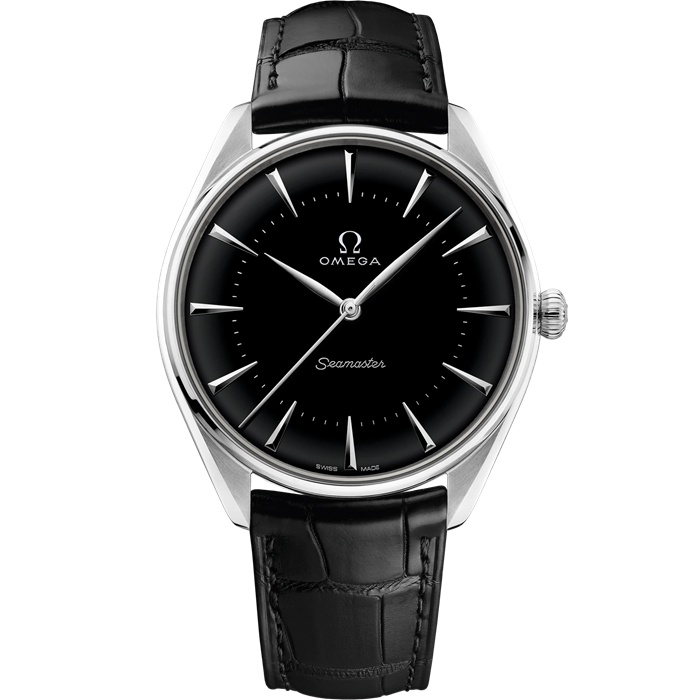 Ce modèle de 39,5mm est doté d’un boîtier façonné dans un alliage unique, composé de 95% de platine et 2% d’or18K. Le cadran bombé en émail noir arbore une minuterie, un logo OMEGA vintage et la mention Seamaster en décalque de platine. Les aiguilles feuilles et les index appliqués sont en or blanc18K.