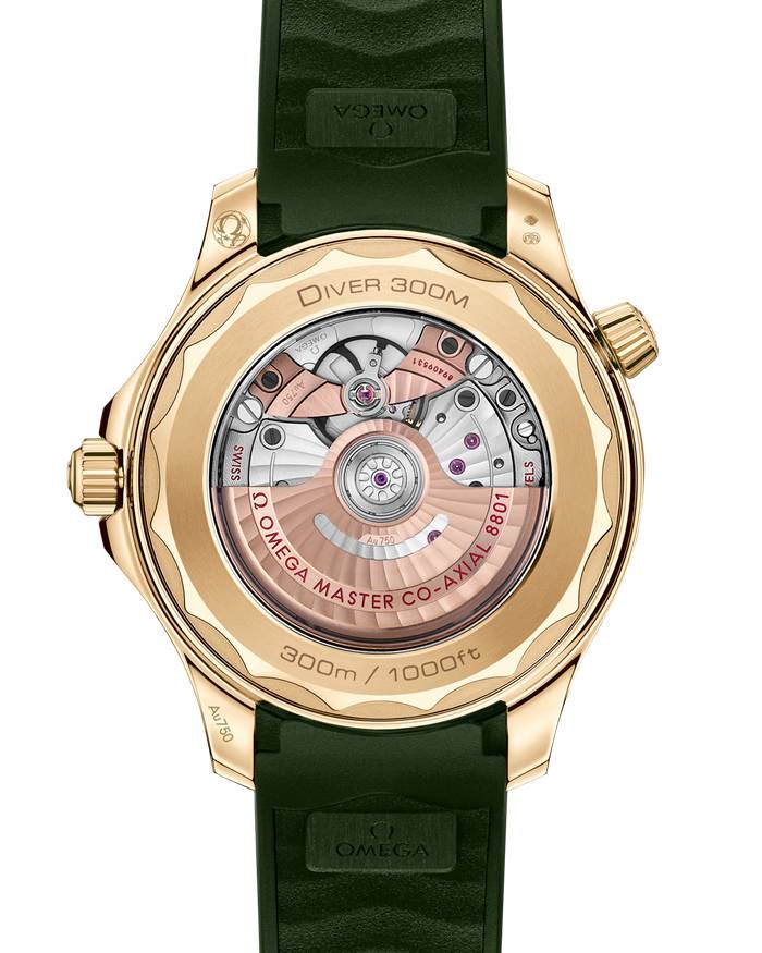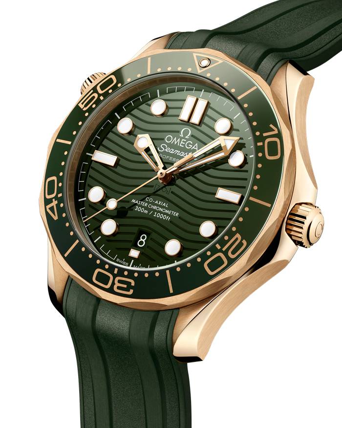 Ce modèle de 42 mm en or Moonshine™ 18K est surmonté d’une lunette en céramique verte arborant une échelle de plongée en Ceragold™. Le cadran, également en céramique verte polie, est décoré de vagues gravées au laser et comporte un guichet de date à 6 heures.