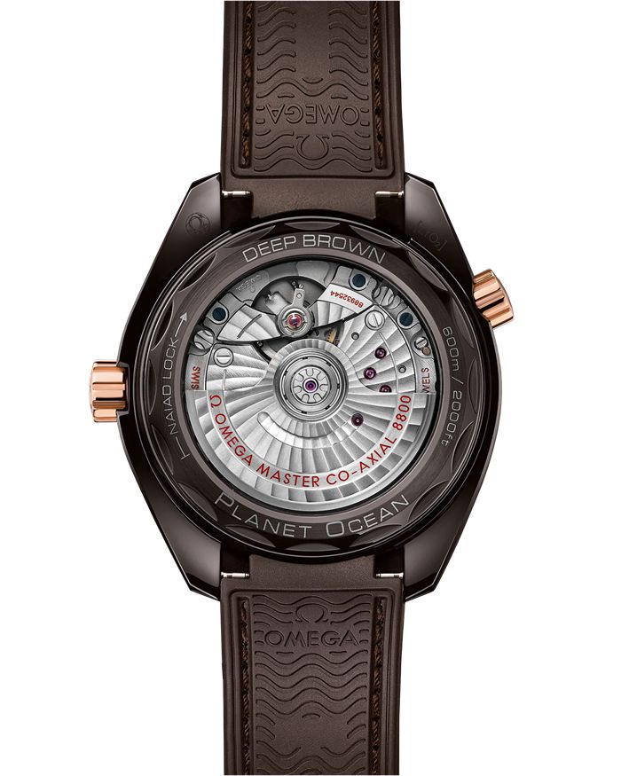 Ce modèle de 39,5mm est doté d’un boîtier et d’une lunette raffinés en céramique brune arborant une échelle de plongée en Ceragold™ OMEGA. Le cadran lui aussi en céramique brune est orné de chiffres, d’index et d’aiguilles en or Sedna™ 18K, et comporte un guichet de date à 3heures.