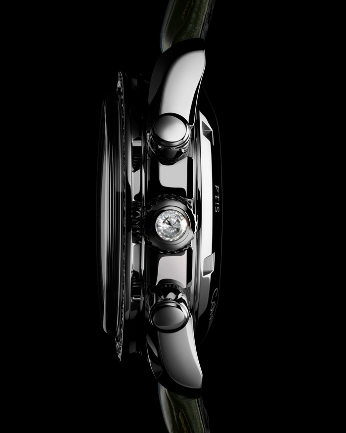 Le cadran vert traité PVD arbore des compteurs ovales horizontaux avec revêtement argenté et un guichet de date ovale vertical à 6 heures. Les aiguilles des heures et des minutes rhodiées polies au diamant sont revêtues de Super-LumiNova blanc à lueur verte.