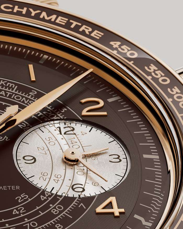 Ce modèle 43 mm a été façonné en or bronze exclusif OMEGA, avec un cadran couleur bronze oxydé arborant une patine spéciale et une finition opaline. Sa lunette en céramique brune polie et son échelle tachymétrique en émail vintage, ses aiguilles feuille et ses chiffres arabes sont également dotés d’un revêtement PVD en or bronze 18K. Un motif circuit façon « spirale » unique se déroule sous les minutes.