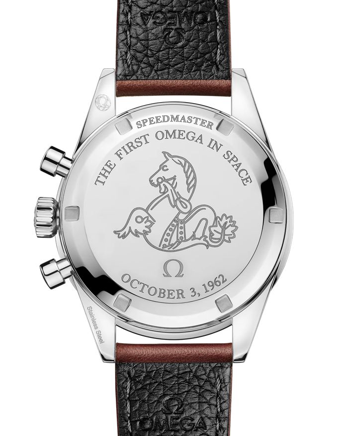 Le cadran est rehaussé d’un logo OMEGA vintage, ainsi que la couronne, tandis que le fond de boîte arbore le célèbre médaillon hippocampe et les gravures «THE FIRST OMEGA IN SPACE» et «OCTOBER 3, 1962».