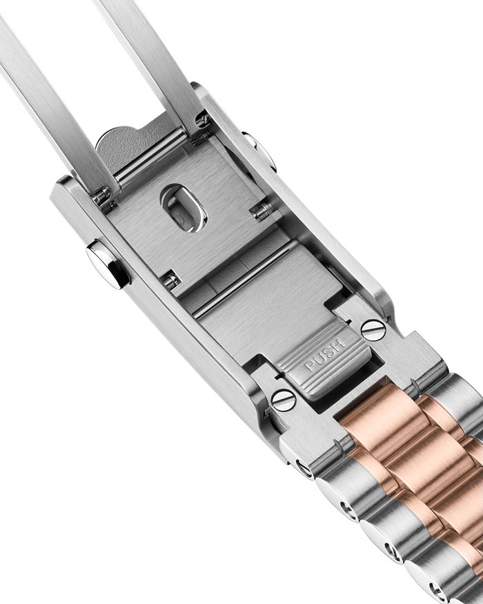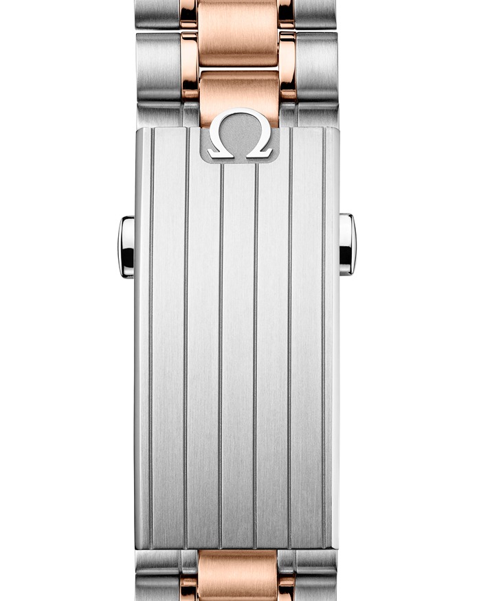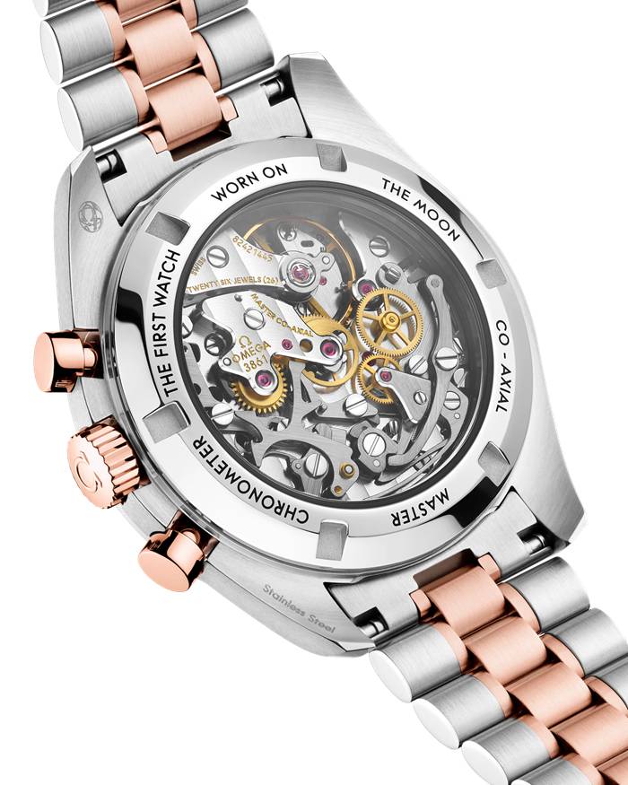 Ce modèle bicolore de 42 mm en acier inoxydable et en or Sedna™ 18K présente un verre saphir sur l’avant comme sur le fond du boîtier. Inspirée de la Speedmaster 4e génération portée sur la Lune, cette montre est dotée d’un boîtier asymétrique avec lunette en céramique noire, et d’une échelle tachymétrique qui affiche le célèbre point au-dessus du chiffre 90 en Ceragold™ OMEGA.