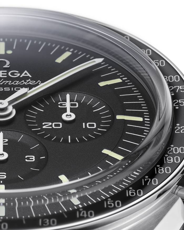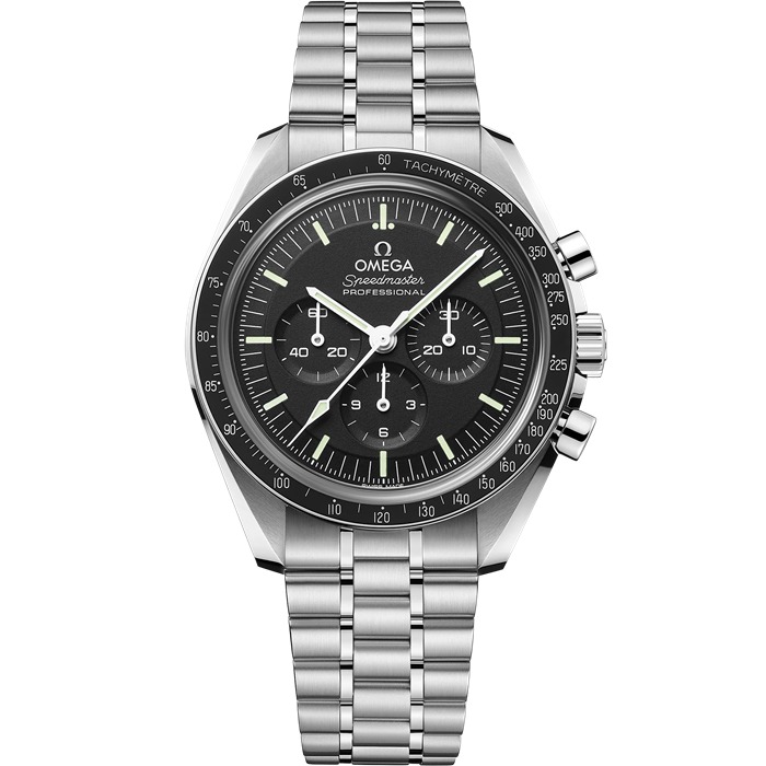 Cette Moonwatch de 42 mm en acier inoxydable est montée sur un bracelet poli et satiné composé de rangs de cinq maillons incurvés. Elle présente un verre saphir sur l’avant comme sur le fond de boîtier. Inspirée de la Speedmaster 4e génération portée sur la Lune, cette montre au boîtier asymétrique arbore un cadran noir à degrés rehaussé du logo OMEGA appliqué. La lunette en aluminium anodisé est quant à elle frappée du point signature au-dessus du chiffre 90.
