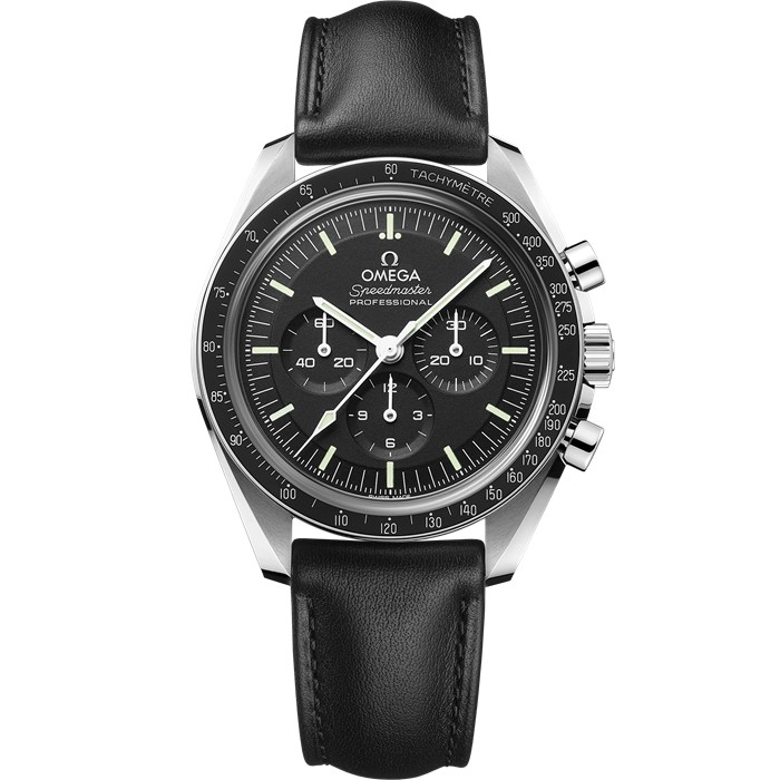 Cette Moonwatch de 42 mm en acier inoxydable est montée sur un bracelet en cuir noir. Elle présente un verre saphir sur l’avant comme sur le fond de boîtier. Inspirée de la Speedmaster 4e génération portée sur la Lune, cette montre au boîtier asymétrique arbore un cadran noir à degrés rehaussé du logo OMEGA appliqué. La lunette en aluminium anodisé est quant à elle frappée du point signature au-dessus du chiffre 90.