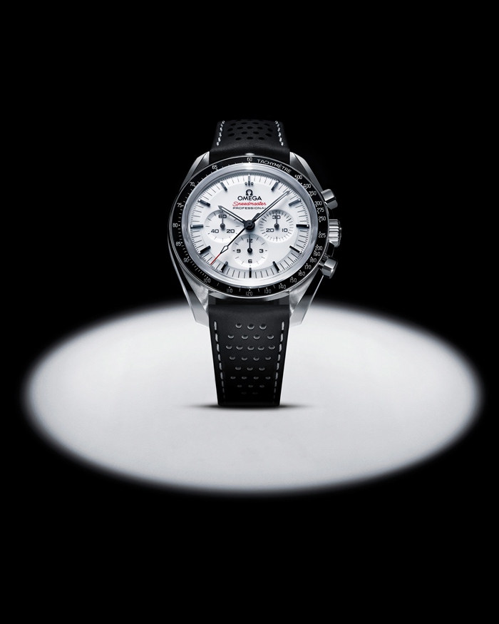Cette Moonwatch de 42 mm en acier inoxydable est montée sur un bracelet en cuir noir micro-perforé avec des surpiqûres blanches et rouges. Elle présente un verre saphir sur l’avant comme sur le fond de boîtier. Inspirée de la Speedmaster 4e génération portée sur la Lune, cette montre au boîtier asymétrique arbore un cadran à étage laqué blanc, rehaussé du logo OMEGA et d’index appliqués, ainsi que des aiguilles style « Moonwatch ». La lunette noire en aluminium anodisé est quant à elle frappée du point signature au-dessus du chiffre 90.