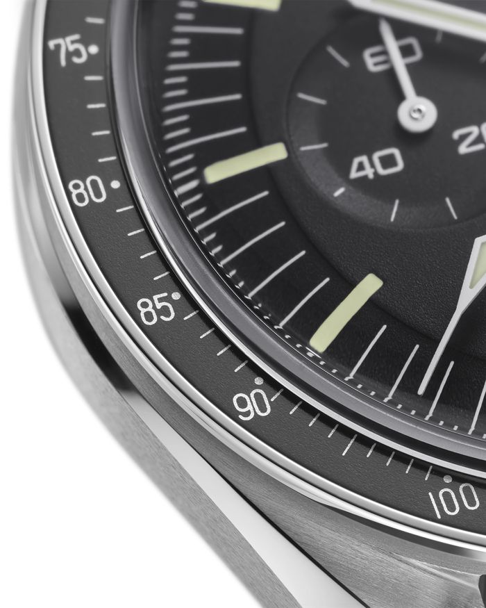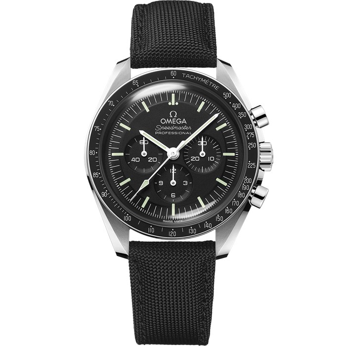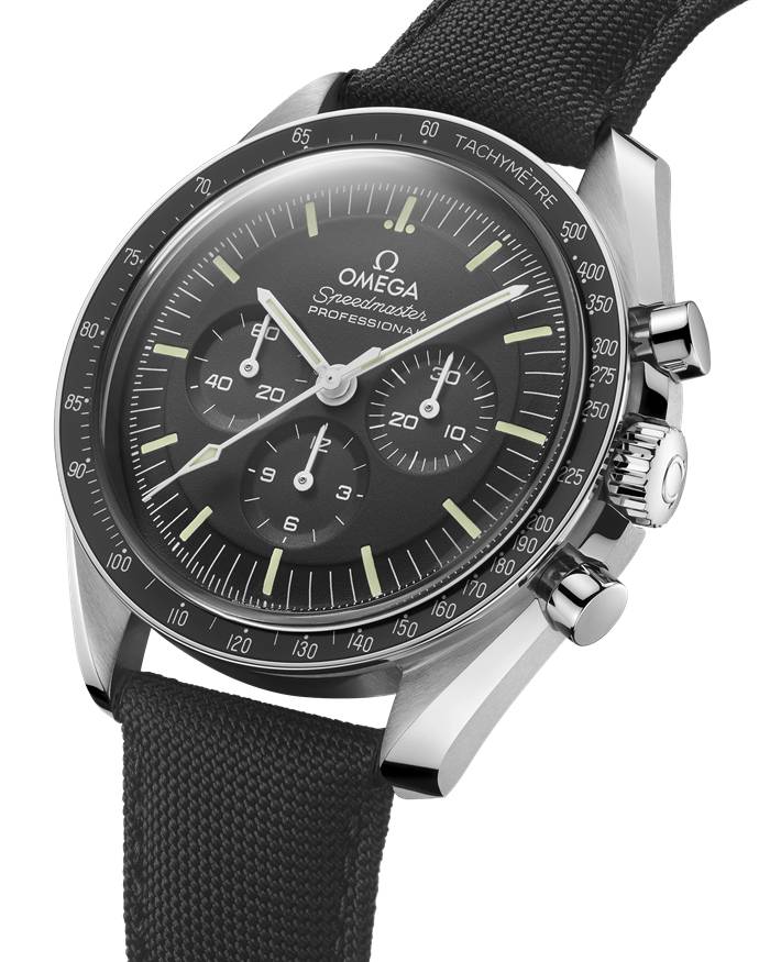Cette Moonwatch de 42 mm en acier inoxydable est montée sur un bracelet en nylon. Elle présente un verre hésalite sur l’avant et un médaillon représentant l’hippocampe OMEGA sur le fond de boîtier. Inspirée de la Speedmaster 4e génération portée sur la Lune, cette montre au boîtier asymétrique arbore un cadran noir à degrés. La lunette en aluminium anodisé est quant à elle frappée du point signature au-dessus du chiffre 90.