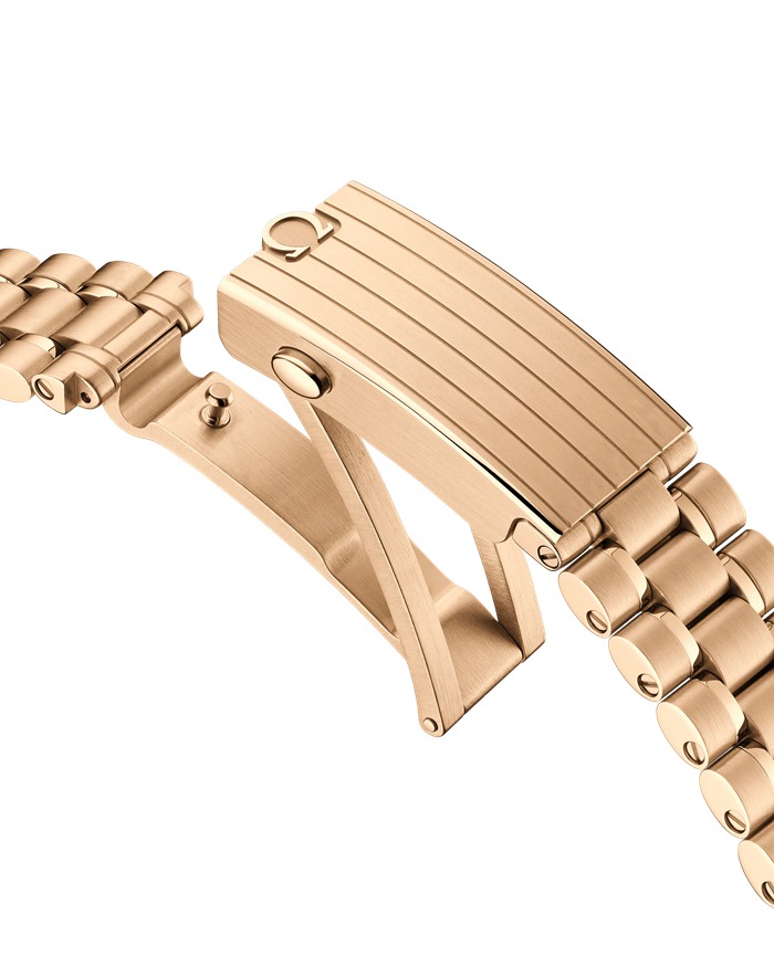 Inspirée de la Speedmaster 4egénération, cette Moonwatch de 42mm, dont le boîtier et le bracelet sont en or Moonshine™18K, arbore un cadran à étage soleillé en PVD vert et des aiguilles de style «Moonwatch». Sa lunette en céramique verte, dotée d’une échelle tachymétrique en Ceragold™ OMEGA, est frappée du point signature au-dessus du chiffre90.