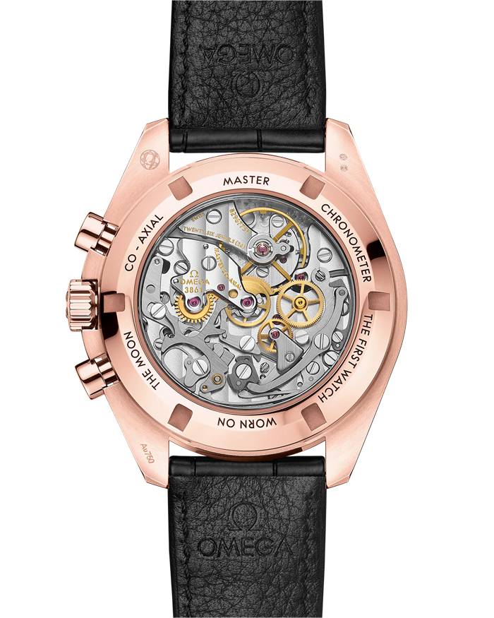 Cette Moonwatch de 42mm en or Sedna™ 18K est montée sur un bracelet en cuir noir. Elle présente un verre saphir sur l’avant comme sur le fond de boîtier. Inspirée de la Speedmaster 4egénération portée sur la Lune, cette montre au boîtier asymétrique arbore un cadran noir à degrés. La lunette en aluminium anodisé est quant à elle frappée du point signature au-dessus du chiffre90.