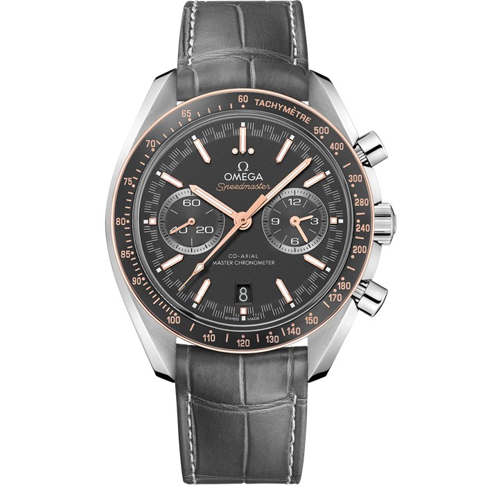 Présentée sur un bracelet en cuir gris, cette Speedmaster Racing Master Chronometer de 44,25mm possède un boîtier en acier inoxydable surmonté d’une lunette en or Sedna™18K. Celle-ci arbore un anneau en nitrure de silicium frappé de l’emblématique échelle tachymétrique en Ceragold™ OMEGA.