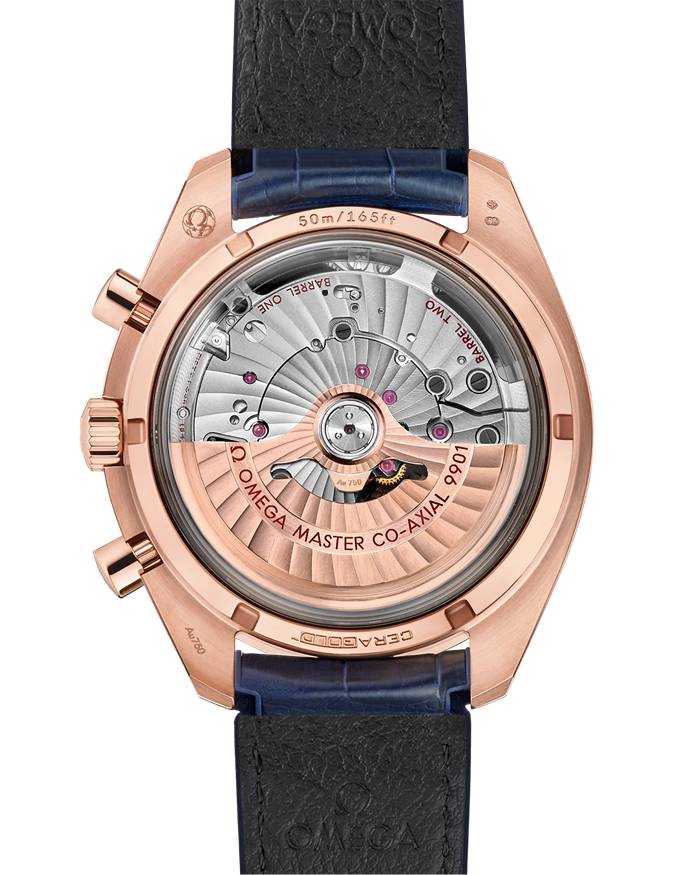 Cette Speedmaster Racing Master Chronometer de 44,25mm possède un boîtier en or Sedna™18K présenté sur un bracelet en cuir bleu. Elle est surmontée d’une lunette en céramique bleue frappée de l’emblématique échelle tachymétrique en Ceragold™ OMEGA.