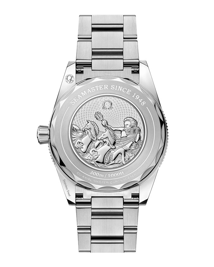 Dotée d’un boîtier symétrique en acier inoxydable poli et satiné, cette Seamaster300 de 41mm est montée sur un bracelet assorti.
